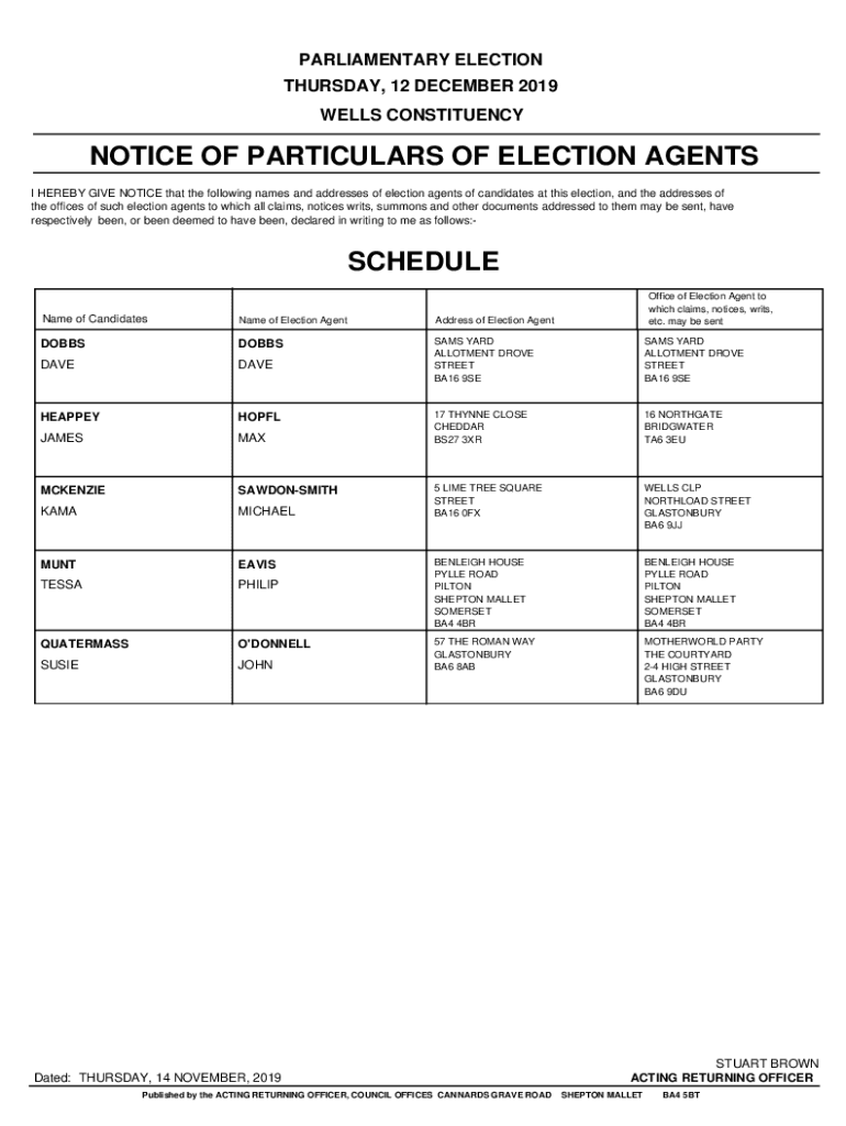 PARLIAMENTARY ELECTION THURSDAY, 12 DECEMBER 2019 WELLS CONSTITUENCYNOTICE OF PARTICULARS OF ELECTION AGENTS I HEREBY GIVE NOTICE that the following names and addresses of election agents of candidates
