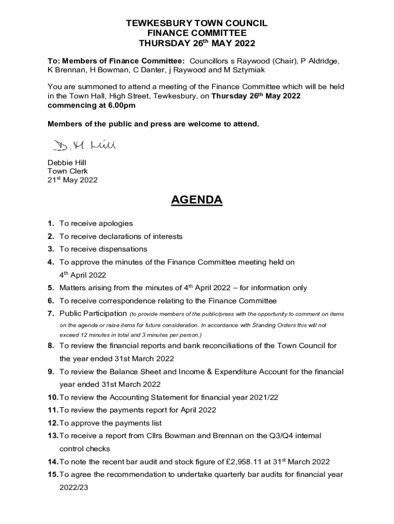 TEWKESBURY TOWN COUNCIL FINANCE COMMITTEE THURSDAY 26th MAY 2022 To: Members of Finance Committee: Councillors s Haywood (Chair), P Aldridge, K Brennan, H Bowman, C Danger, j Haywood and M Stymied