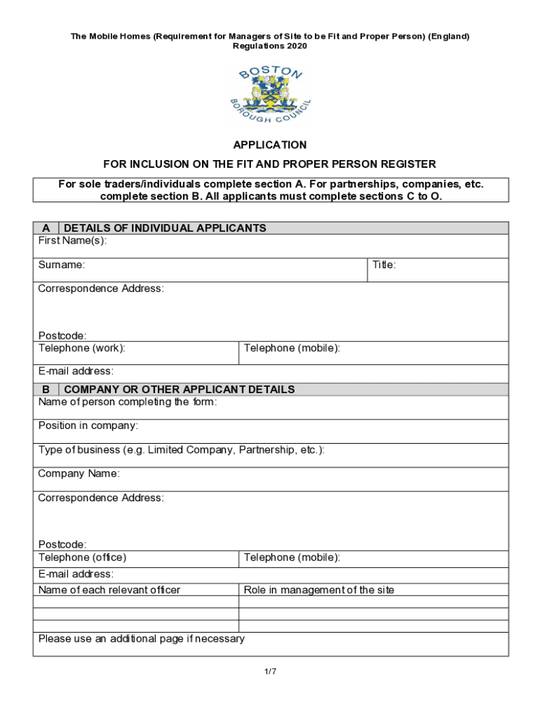 The Mobile Homes (Requirement for Managers of Site to be Fit and Proper Person) (England) Regulations 2020APPLICATION FOR INCLUSION ON THE FIT AND PROPER PERSON REGISTER For sole traders/individuals