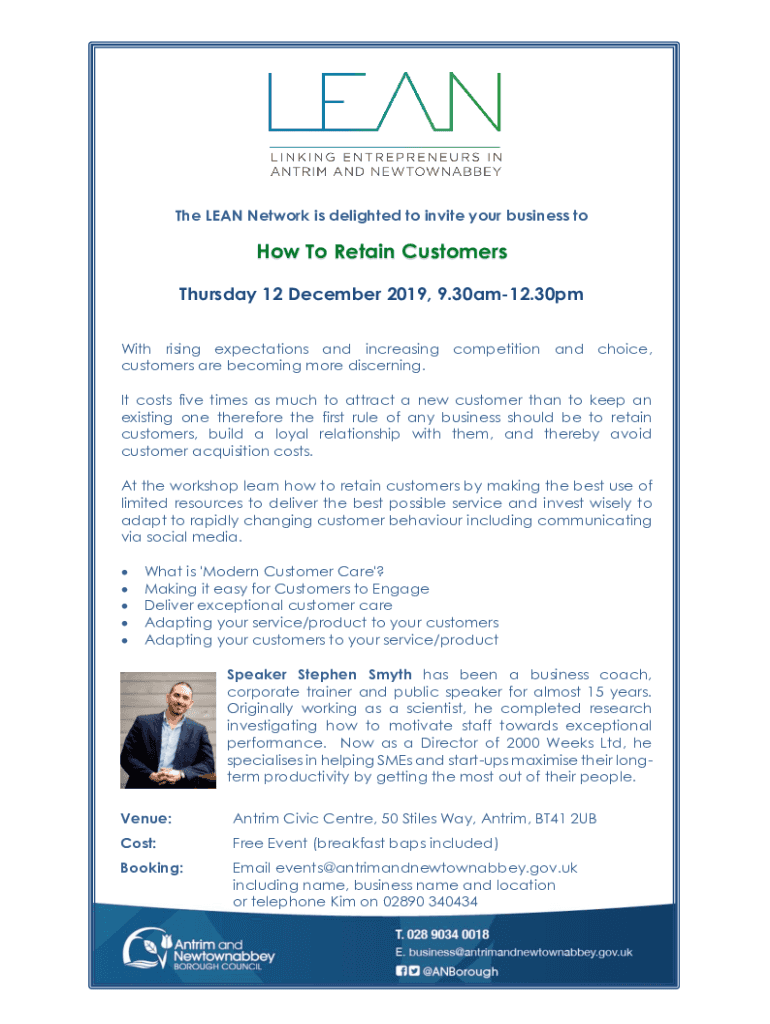 The LEAN Network is delighted to invite your business nohow To Retain Customers Thursday 12 December 2019, 9.30am12.30pm With rising expectations and increasing competition and choice, customers are