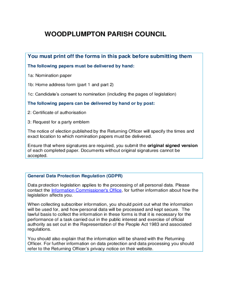WOODPLUMPTON PARISH Councilor must print off the forms in this pack before submitting them The following papers must be delivered by hand: 1a: Nomination paper 1b: Home address form (part 1 and part