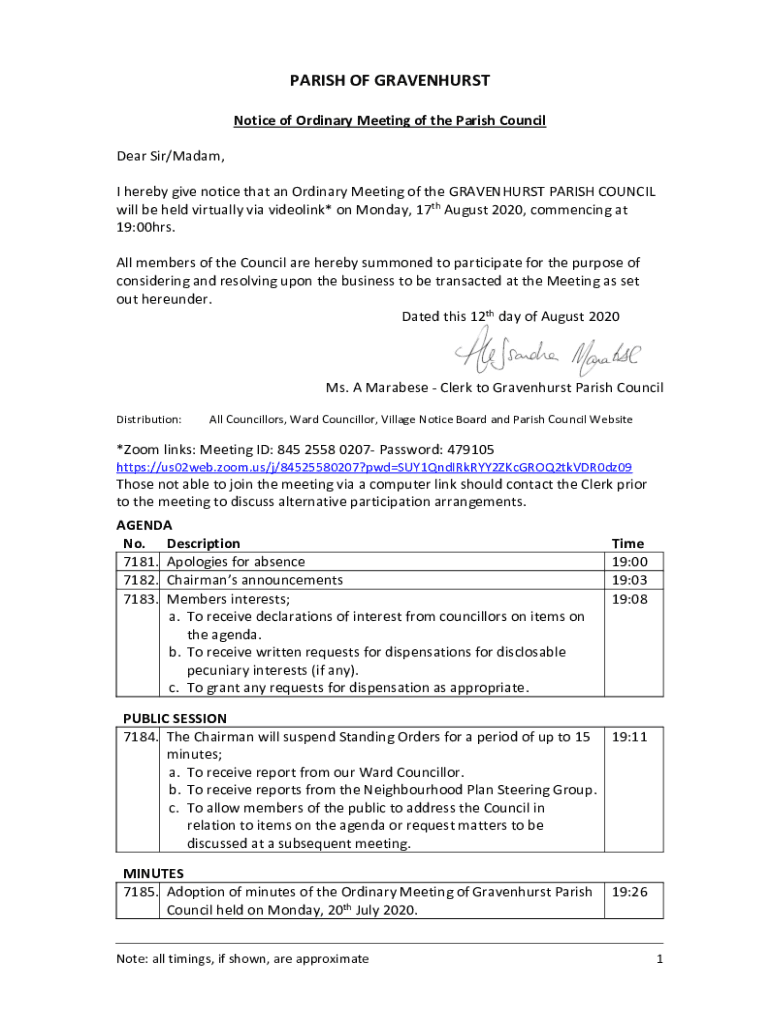 I hereby give notice that an Ordinary Meeting of the GRAVENHURST PARISH COUNCIL