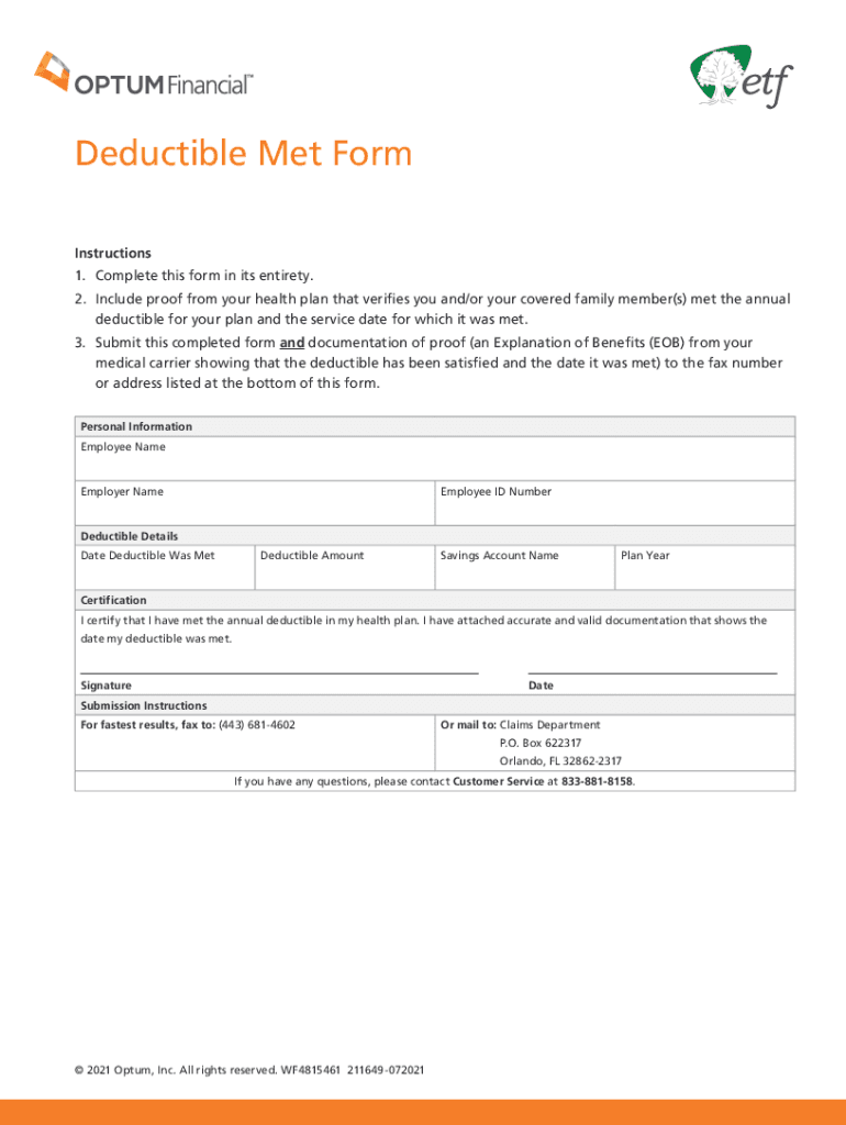 Deductible Met Form Instructions 1. Complete this form in its entirety. 2. Include proof from your health plan that verifies you and/or your covered family member(s) met the annual deductible for