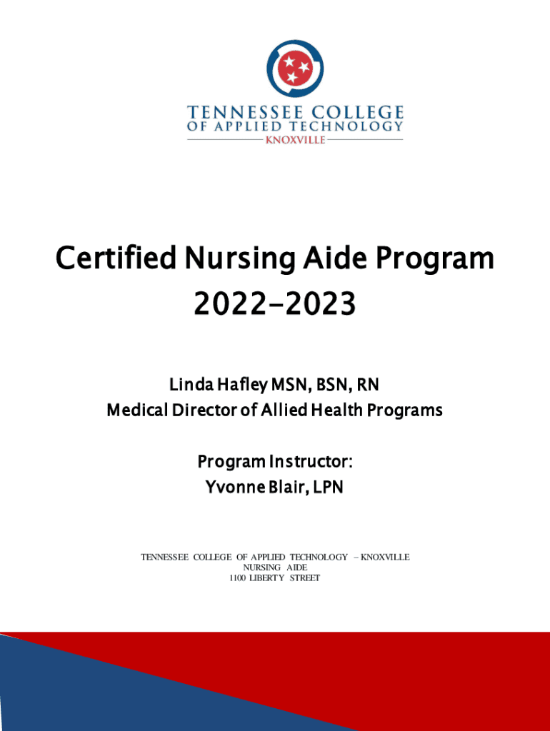 Certified Nursing Aide Program 20222023 Linda Harley MSN, BSN, RN Medical Director of Allied Health Programs Program Instructor: Yvonne Blair, TENNESSEE COLLEGE OF APPLIED TECHNOLOGY KNOXVILLE NURSING