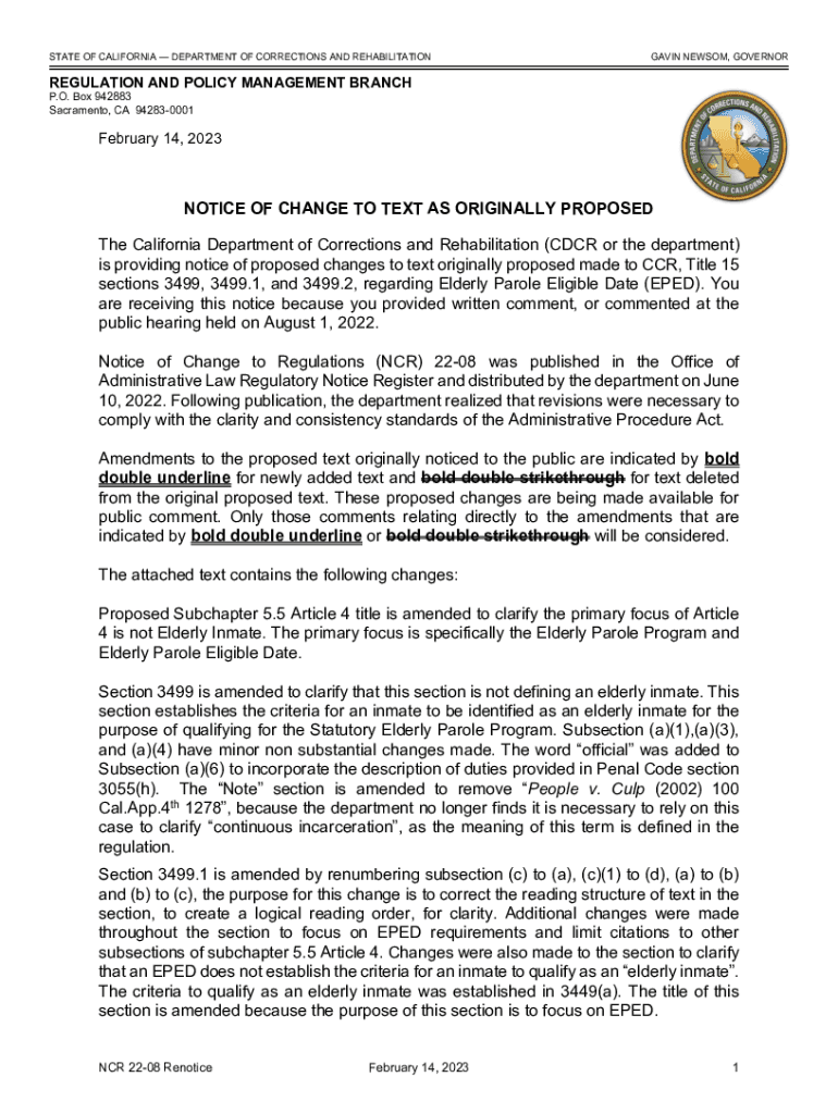 STATE OF CALIFORNIA DEPARTMENT OF CORRECTIONS AND REHABILITATIONGAVIN NEWSOM, GOVERNORREGULATION AND POLICY MANAGEMENT BRANCH P.O. Box 942883 Sacramento, CA 942830001February 14, 2023NOTICE OF CHANGE