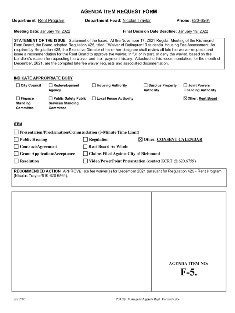 AGENDA ITEM REQUEST FORM Department: Rent ProgramDepartment Head: Nicolas TraylorMeeting Date: January 19, 2022Phone: 6206564Final Decision Date Deadline: January 19, 2022STATEMENT OF THE ISSUE: Statement