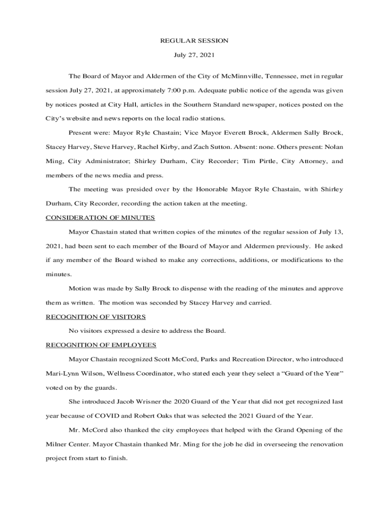 REGULAR SESSION July 27, 2021The Board of Mayor and Aldermen of the City of McMinnville, Tennessee, met in regular session July 27, 2021, at approximately 7:00 p.m. Adequate public notice of the agenda