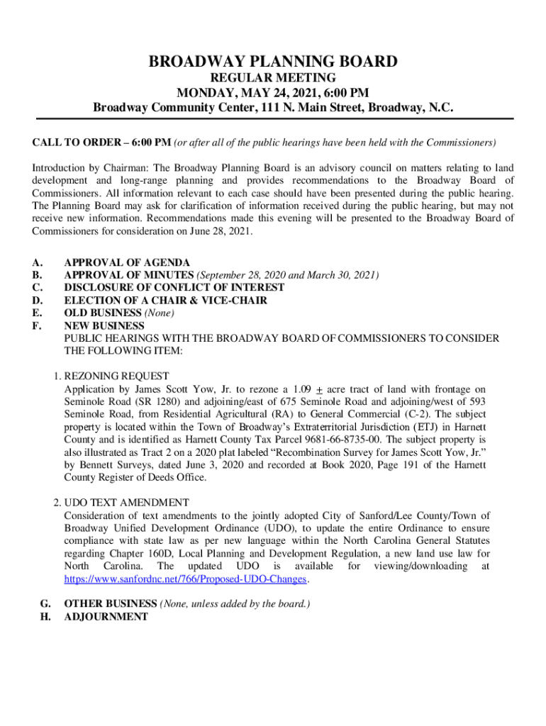 BROADWAY PLANNING BOARD REGULAR MEETING MONDAY, MAY 24, 2021, 6:00 PM Broadway Community Center, 111 N. Main Street, Broadway, N.C. CALL TO ORDER 6:00 PM (or after all the public hearings have been