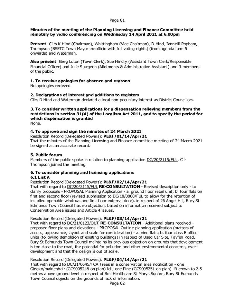 Page 01 Minutes of the meeting of the Planning Licensing and Finance Committee held remotely by video conferencing on Wednesday 14 April 2021 at 6.00pm Present: Class K Hind (Chairman), Whittingham
