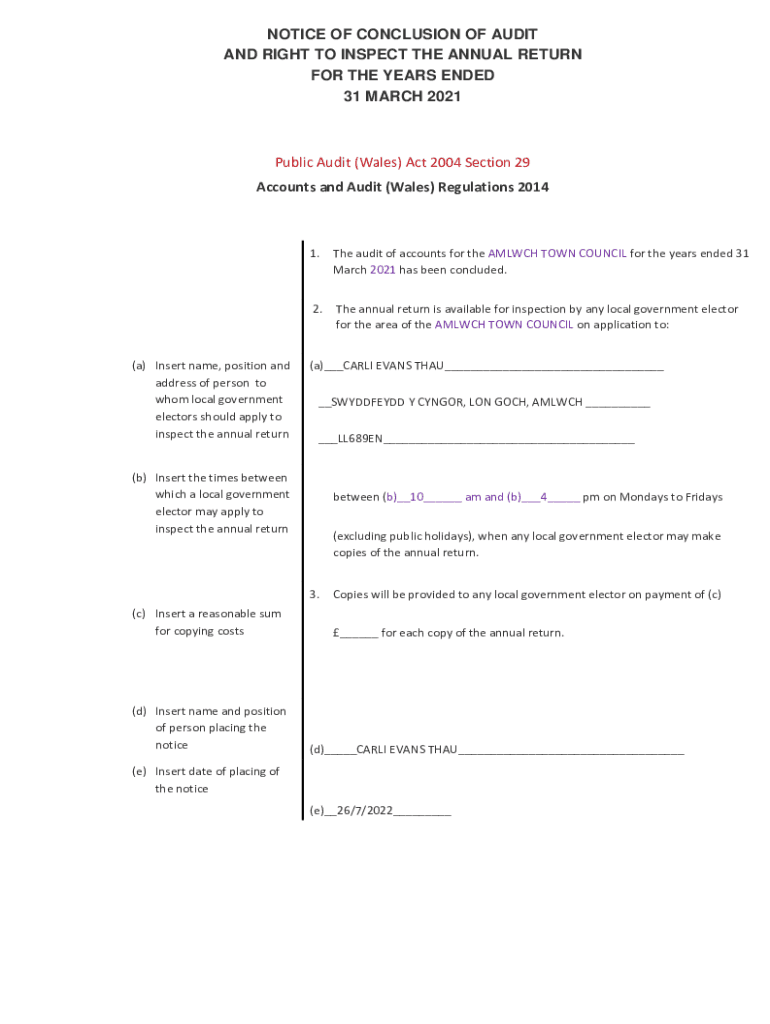 Get the free notice of conclusion of audit and right to inspect the annual ...