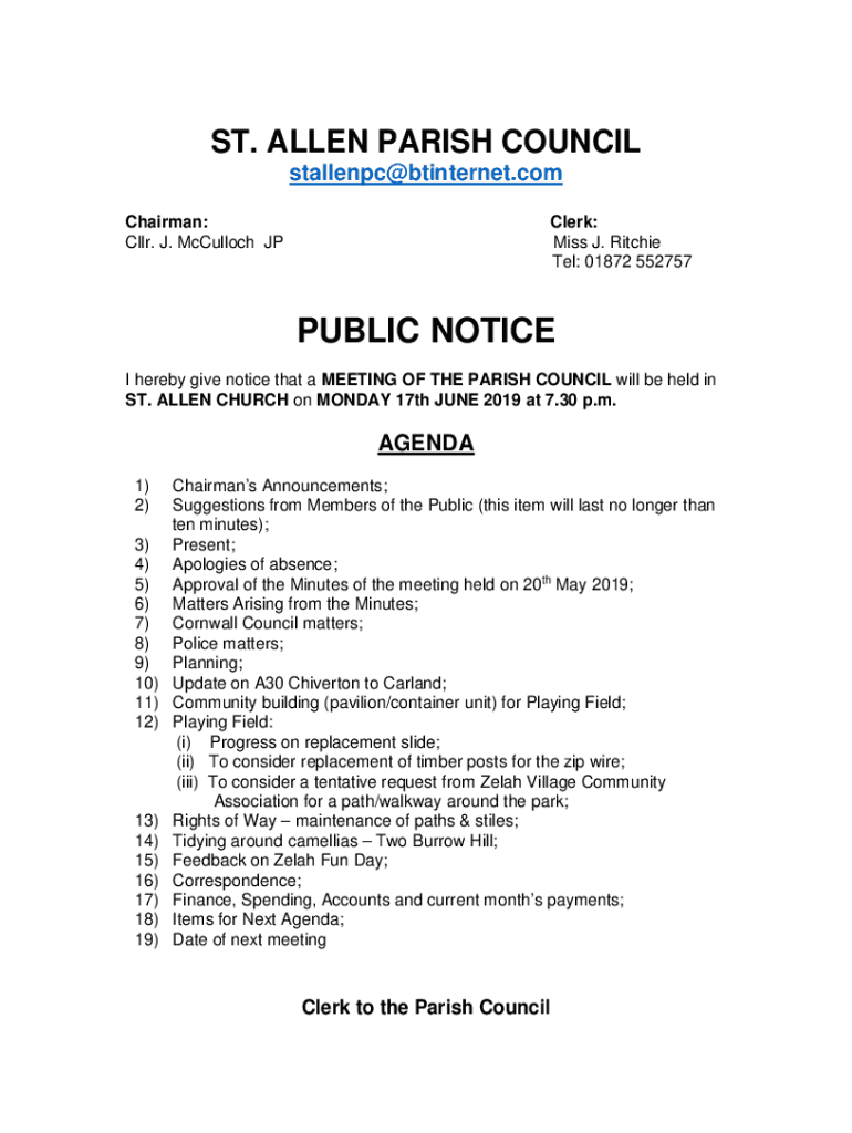 ST. ALLEN PARISH COUNCIL stallenpc@btinternet.com Chairman: CLR. J. McCulloch Clerk: Miss J. Ritchie Tel: 01872 552757PUBLIC NOTICE I hereby give notice that a MEETING OF THE PARISH COUNCIL will be
