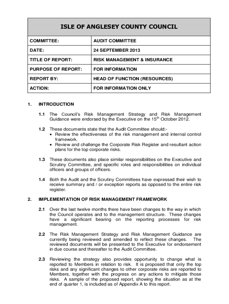 ISLE OF ANGLE SEY COUNTY COUNCIL COMMITTEE:AUDIT COMMITTEEMAN:24 SEPTEMBER 2013TITLE OF REPORT:RISK MANAGEMENT & INSURANCEPURPOSE OF REPORT:FOR INFORMATIONREPORT BY:HEAD OF FUNCTION (RESOURCES)ACTION:FOR