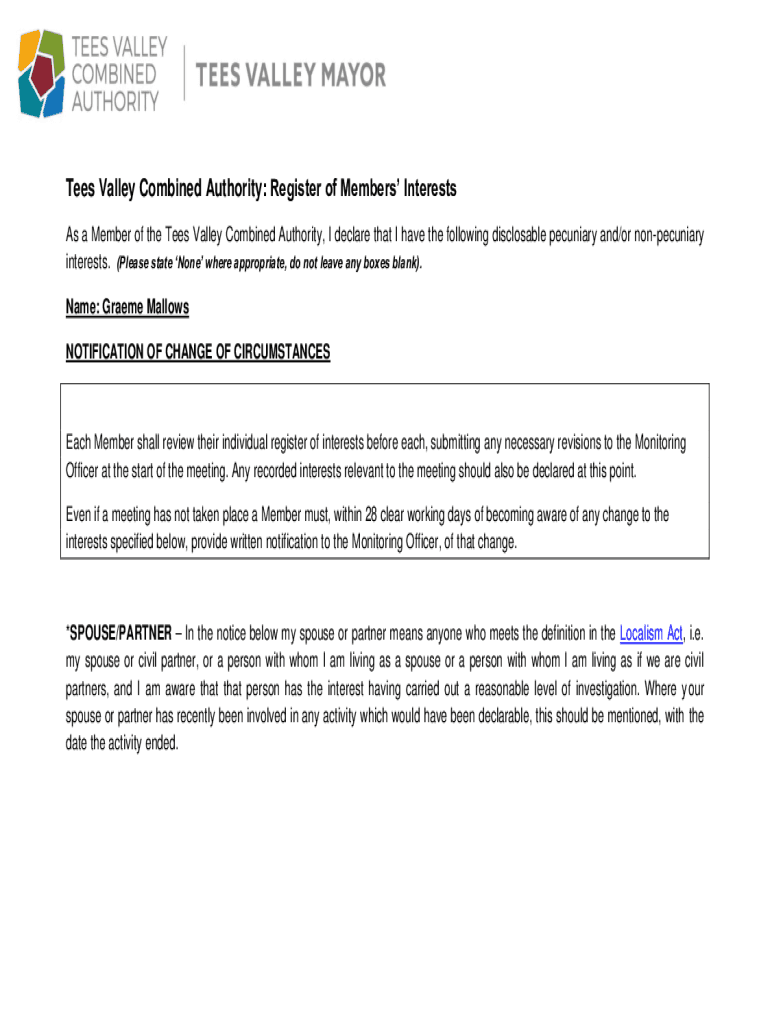 Tees Valley Combined Authority: Register of Members Interests As a Member of the Tees Valley Combined Authority, I declare that I have the following disclosable pecuniary and/or nonpecuniary interests.