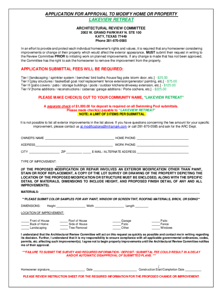 APPLICATION FOR APPROVAL TO MODIFY HOME OR PROPERTY REVIEW RETREAT ARCHITECTURAL REVIEW COMMITTEE 2002 W. GRAND PARKWAY N. STE 100 KATY, TEXAS 77449 Phone 2818700585 In an effort to provide and protect