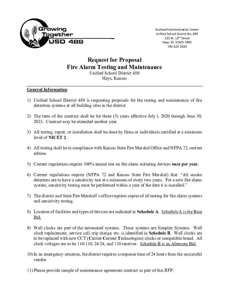 Rockwell Administration Center Unified School District No. 489 323 W. 12th Street Hays, KS 676013893 7856232420Request for Proposal Fire Alarm Testing and Maintenance Unified School District 489 Hays,
