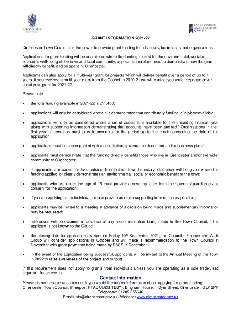 GRANT INFORMATION 202122 Cirencester Town Council has the power to provide grant funding to individuals, businesses and organizations. Applications for grant funding will be considered where the funding
