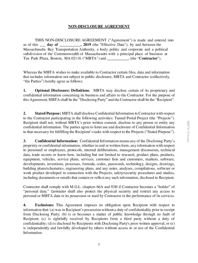 NONDISCLOSURE AGREEMENTS NONDISCLOSURE AGREEMENT (\” Agreement\”) is made and entered into as of this ___ day of ___, 2019 (the \” Effective Date\”), by and between the Massachusetts Bay Transportation