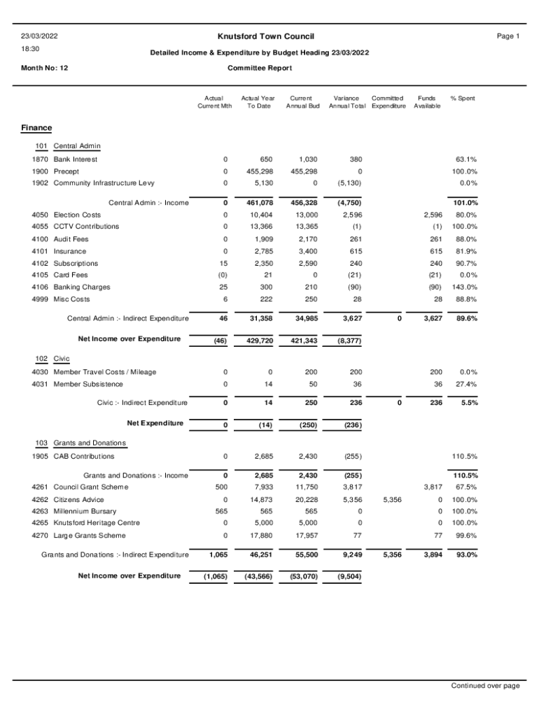 23/03/2022Page 1Knutsford Town Council18:30Detailed Income & Expenditure by Budget Heading 23/03/2022Month No: 12Committee ReportActual Current Actual Year To Deterrent Annual Variance Committed Annual