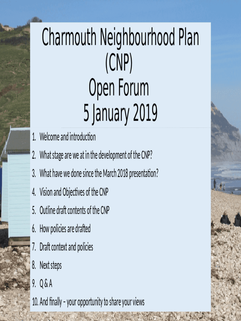 Char mouth Neighborhood Plan (CNP) Open Forum 5 January 2019 1. Welcome and introduction 2. What stage are we at in the development of the CNP? 3. What have we done since the March 2018 presentation?