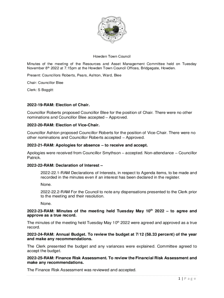 Holden Town Council Minutes of the meeting of the Resources and Asset Management Committee held on Tuesday, November 8th 2022 at 7.15pm at the Holden Town Council Offices, Bridge gate, Holden. Present: