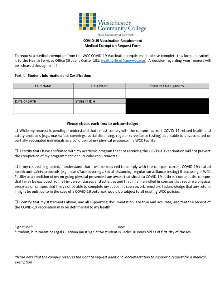 COVID-19 Vaccination Requirement Medical Exemption Request Form To request a medical exemption from the WCC COVID-19 Vaccination requirement, please complete this form and submit it to the Health