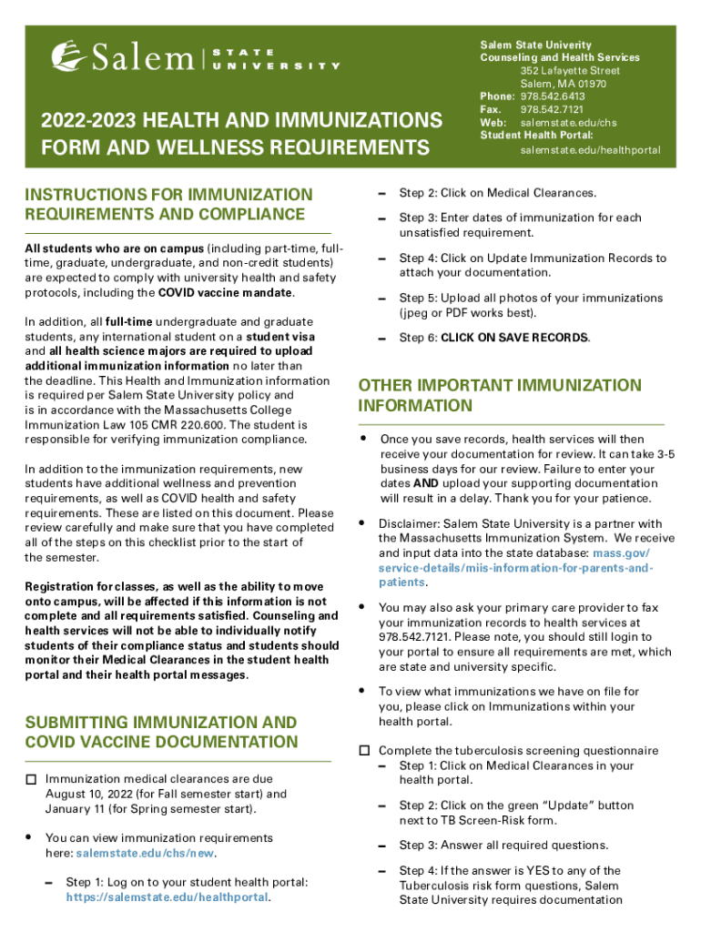 20222023 HEALTH AND IMMUNIZATIONS FORM AND WELLNESS REQUIREMENTS INSTRUCTIONS FOR IMMUNIZATION REQUIREMENTS AND COMPLIANCE All students who are on campus (including part-time, full time, graduate,