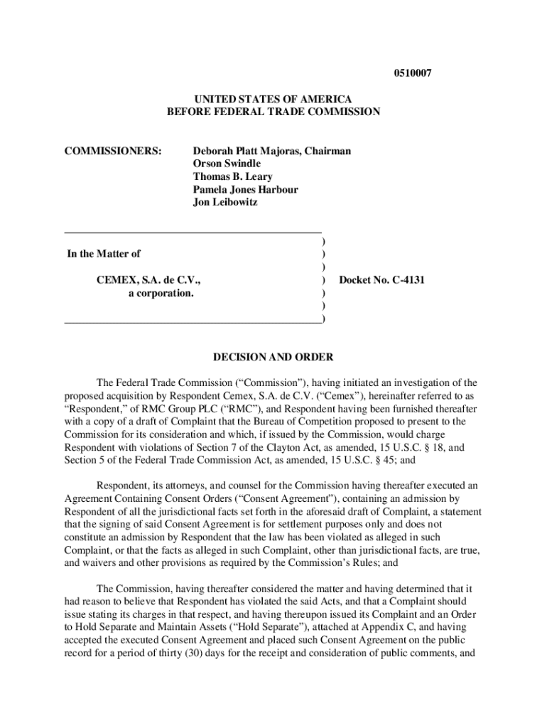0510007 UNITED STATES OF AMERICA BEFORE FEDERAL TRADE COMMISSIONCOMMISSIONERS:Deborah Platt Majors, Chairman Orson Swindle Thomas B. Leary Pamela Jones Harbor Jon Leibniz___) In the Matter of)) CEMEX,