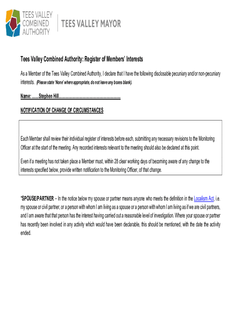 Tees Valley Combined Authority: Register of Members Interests As a Member of the Tees Valley Combined Authority, I declare that I have the following disclosable pecuniary and/or nonpecuniary interests.