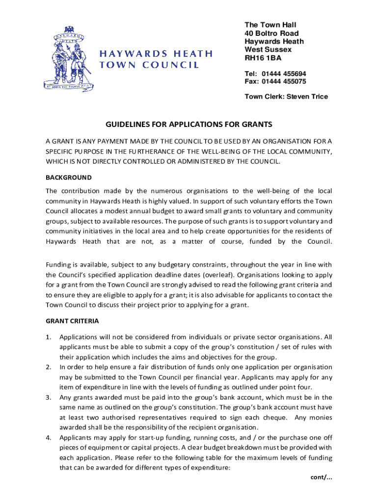 The Town Hall 40 Bolero Road Hayward's Heath West Sussex RH16 1BA Tel: 01444 455694 Fax: 01444 455075 Town Clerk: Steven TriceGUIDELINES FOR APPLICATIONS FOR GRANTS A GRANT IS ANY PAYMENT MADE BY