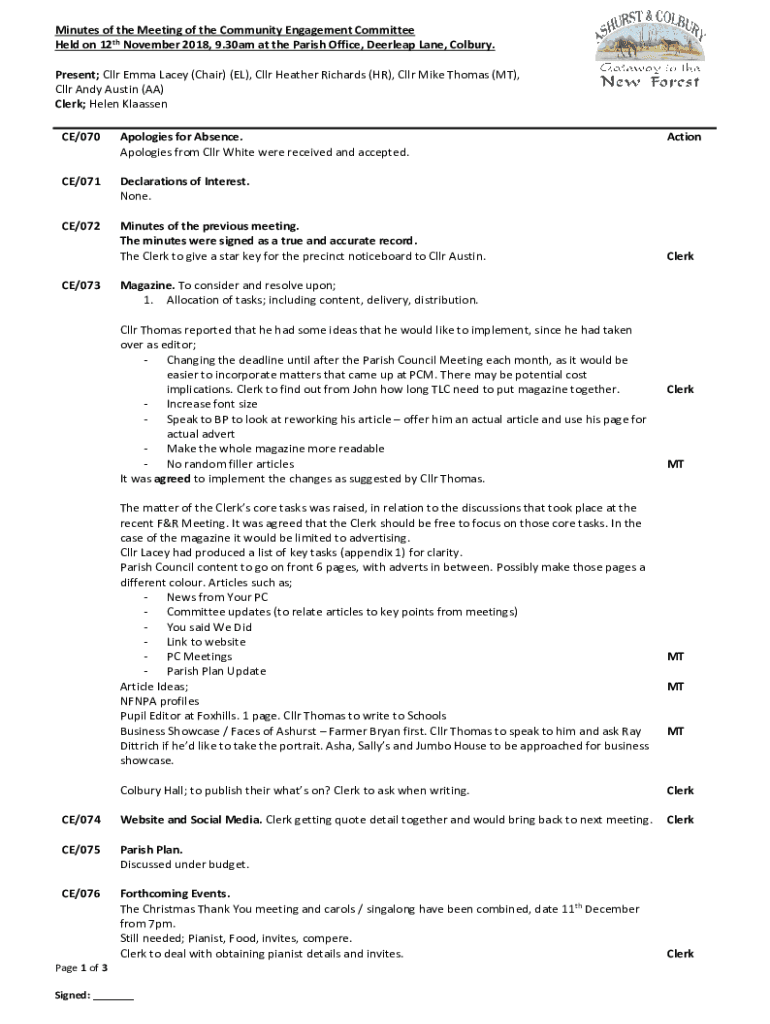 Minutes of the Meeting of the Community Engagement Committee Held on 12th November 2018, 9.30am at the Parish Office, Deer leap Lane, Col bury. Present; CLR Emma Lacey (Chair) (EL), CLR Heather Richards
