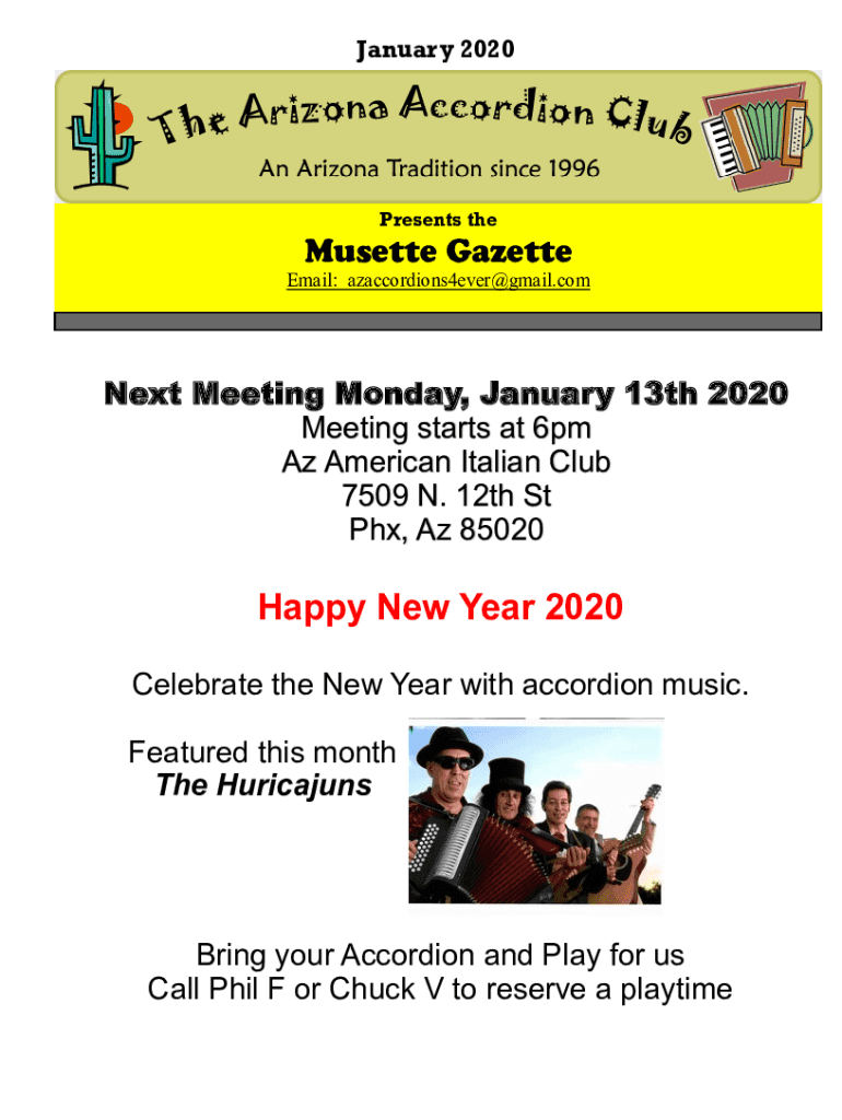 January 2020Presents musette Gazette Email: azaccordions4ever@gmail.comNext Meeting Monday, January 13th 2020 Meeting starts at 6pm AZ American Italian Club 7509 N. 12th St PHX, AZ 85020Happy New