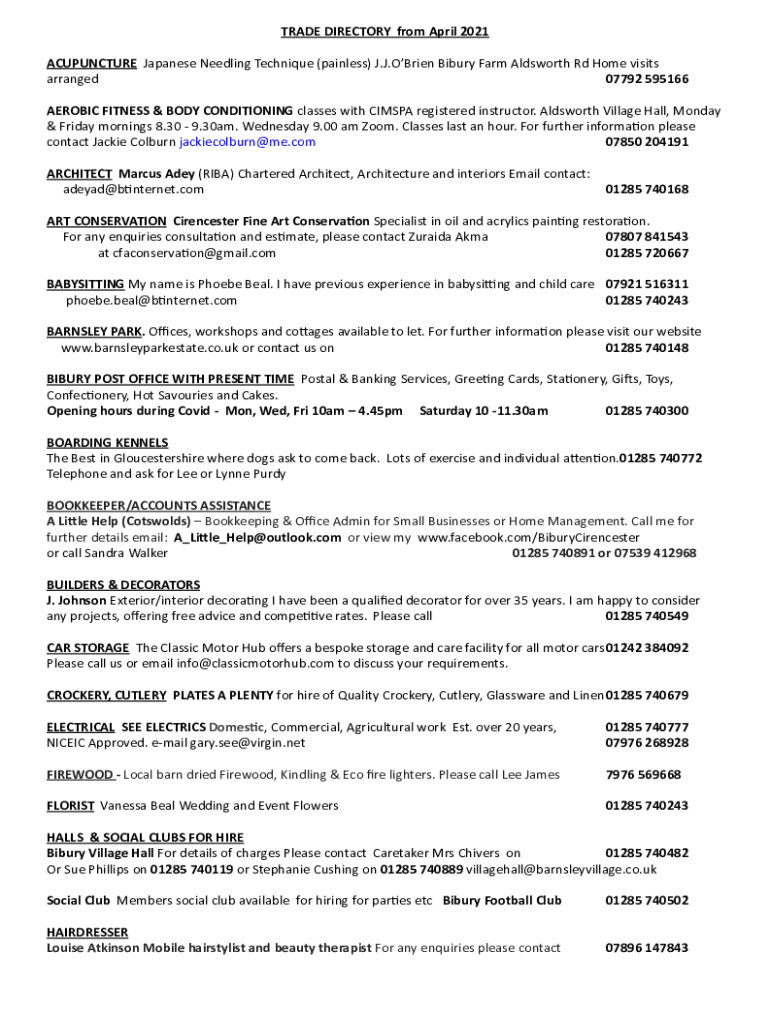 TRADE DIRECTORY from April 2021 ACUPUNCTURE Japanese Needling Technique (painless) J.J.O'Brien Bi bury Farm Ainsworth Rd Home visits arranged 07792 595166 AEROBIC FITNESS & BODY CONDITIONING classes