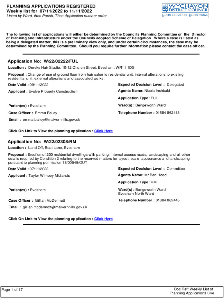 PLANNING APPLICATIONS REGISTERED Weekly list for 07/11/2022 to 11/11/2022 Listed by Ward, then Parish, Then Application number order following list of applications will either be determined by the