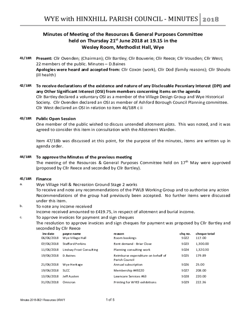 WE with WINDMILL PARISH COUNCIL MINUTES 2018 Minutes of Meeting of the Resources & General Purposes Committee held on Thursday 21st June 2018 at 19.15 in the Wesley Room, Methodist Hall, We 41/18RPresent: