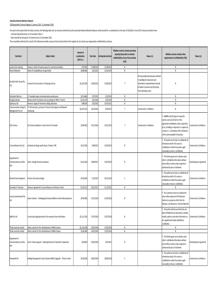 Australian National Maritime Museum 2018 Reportable Contracts Register (1 January 2018 31 December 2018) Pursuant to the Senate Order for Entity Contracts, the following table sets out contracts entered