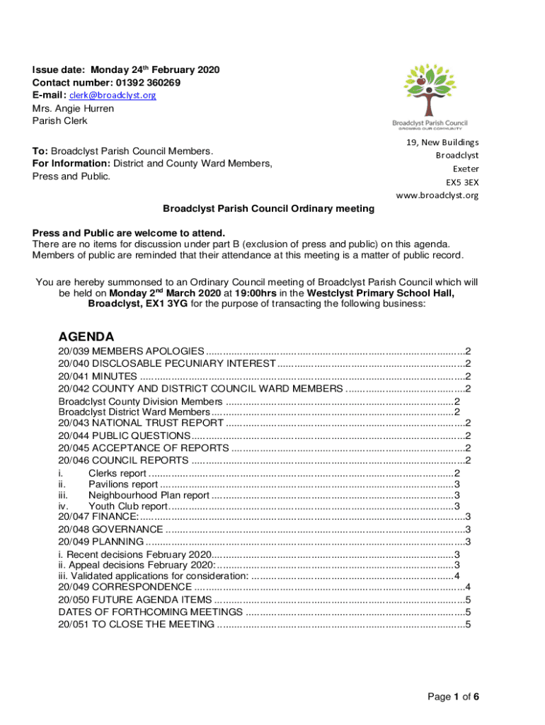 Issue date: Monday 24th February 2020 Contact number: 01392 360269 Email: clerk@broadclyst.org Mrs. Angie Current Parish Clerk To: Broadcast Parish Council Members. For Information: District and County