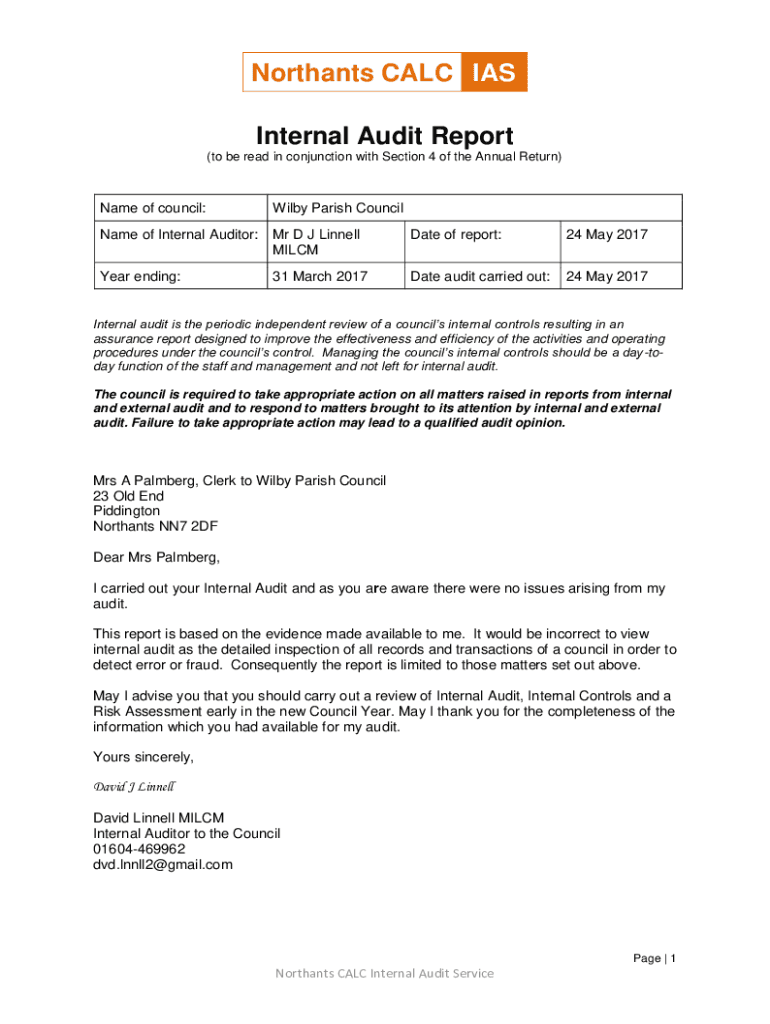 North ants CALL IAS Internal Audit Report (to be read in conjunction with Section 4 of the Annual Return)Name of council:Wiley Parish Councilman of Internal Auditor:Mr D J Linnell Militate of report:24