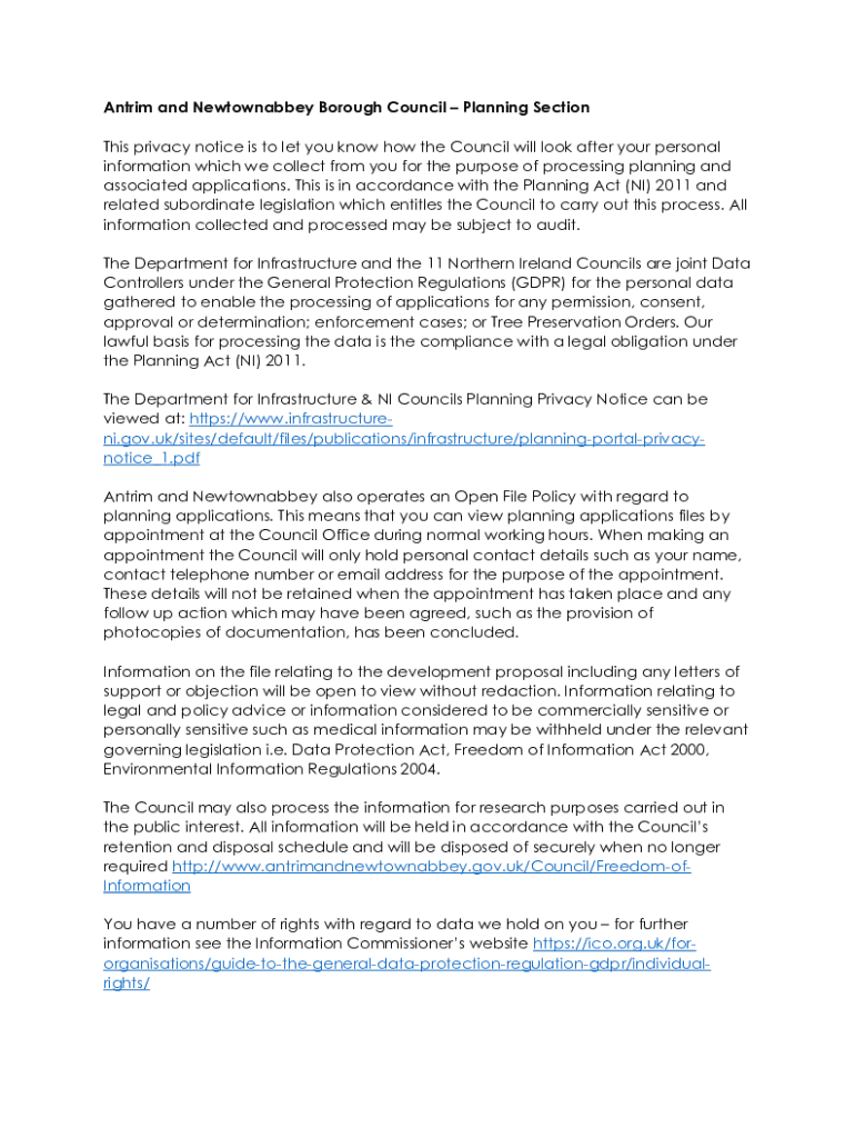 Antrum and Newtownabbey Borough Council Planning Section This privacy notice is to let you know how the Council will look after your personal information which we collect from you for the purpose
