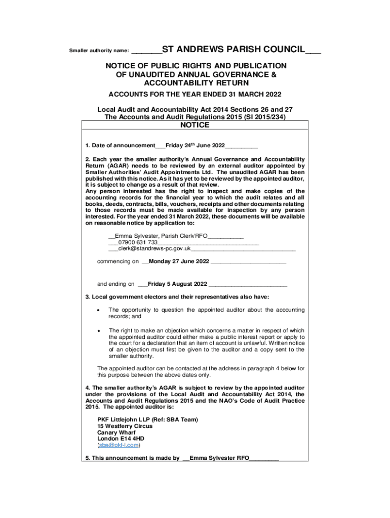 Smaller authority name:___ST ANDREWS PARISH COUNCIL___NOTICE OF PUBLIC RIGHTS AND PUBLICATION OF UNAUDITED ANNUAL GOVERNANCE & ACCOUNTABILITY RETURN ACCOUNTS FOR THE YEAR ENDED 31 MARCH 2022 Local
