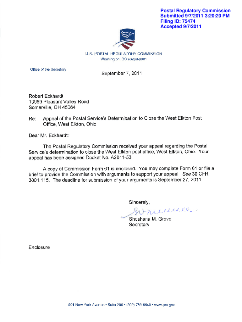 Postal Regulatory Commission Submitted 9/7/2011 3:20:20 PM Filing ID: 75474 Accepted 9/7/2011U. S. POSTAL REGULATORY COMMISSION Washington, DC 202680001 Office of the Secretary September 7,2011Robert