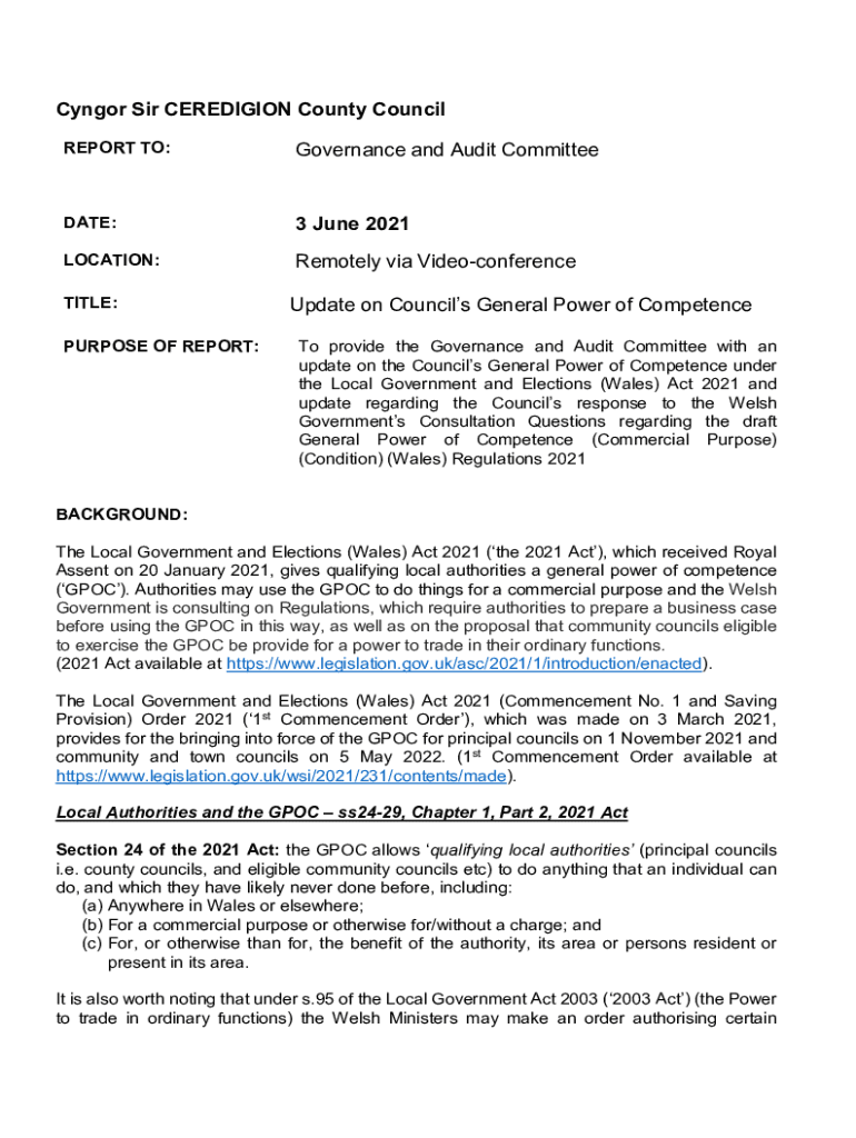 Congo Sir CEREDIGION County Council REPORT TO:Governance and Audit Committeeman:3 June 2021LOCATION:Remotely via VideoconferenceTITLE: PURPOSE OF REPORT:Update on Councils General Power of Competence
