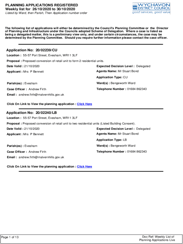 PLANNING APPLICATIONS REGISTERED Weekly list for 26/10/2020 to 30/10/2020 Listed by Ward, then Parish, Then Application number order following list of applications will either be determined by the