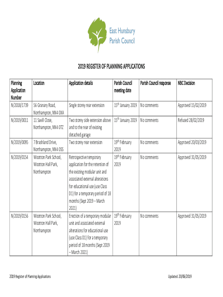 2019 REGISTER OF PLANNING APPLICATIONS Planning Application Number N/2018/1739 N/2019/0011 N/2019/0095 N/2019/0154 N/2019/0156LocationApplication detailsParish Council meeting dateParish Council