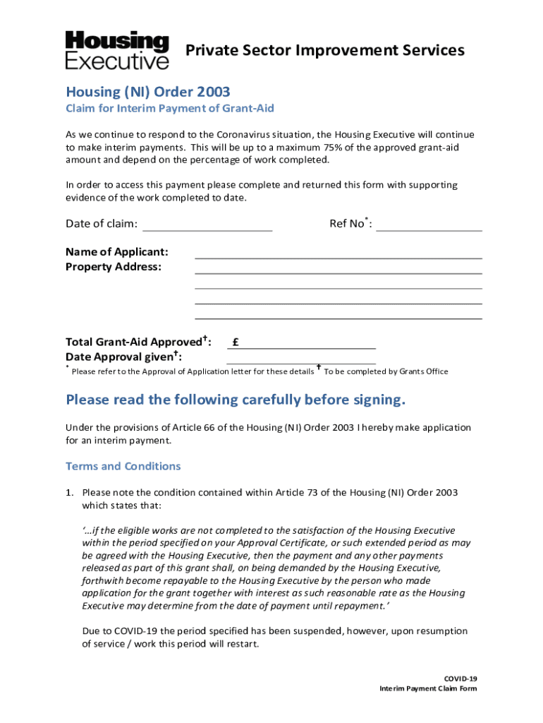 Private Sector Improvement Services Housing (NI) Order 2003 Claim for Interim Payment of Granted As we continue to respond to the Coronavirus situation, the Housing Executive will continue to make