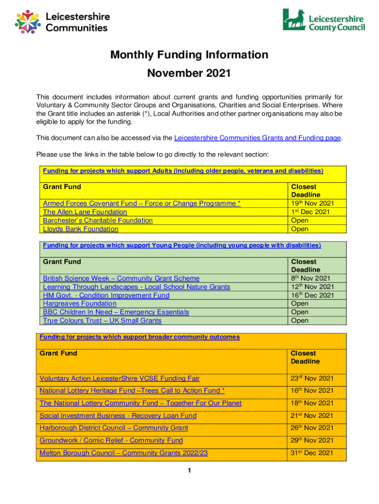 Monthly Funding Information November 2021 This document includes information about current grants and funding opportunities primarily for Voluntary & Community Sector Groups and Organizations, Charities