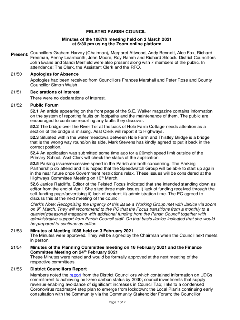 FEASTED PARISH COUNCIL Minutes of the 1087th meeting held on 3 March 2021 at 6:30 pm using the Zoom online platform Present: Councillors Graham Harvey (Chairman), Margaret Atwood, Andy Bennett, Alec