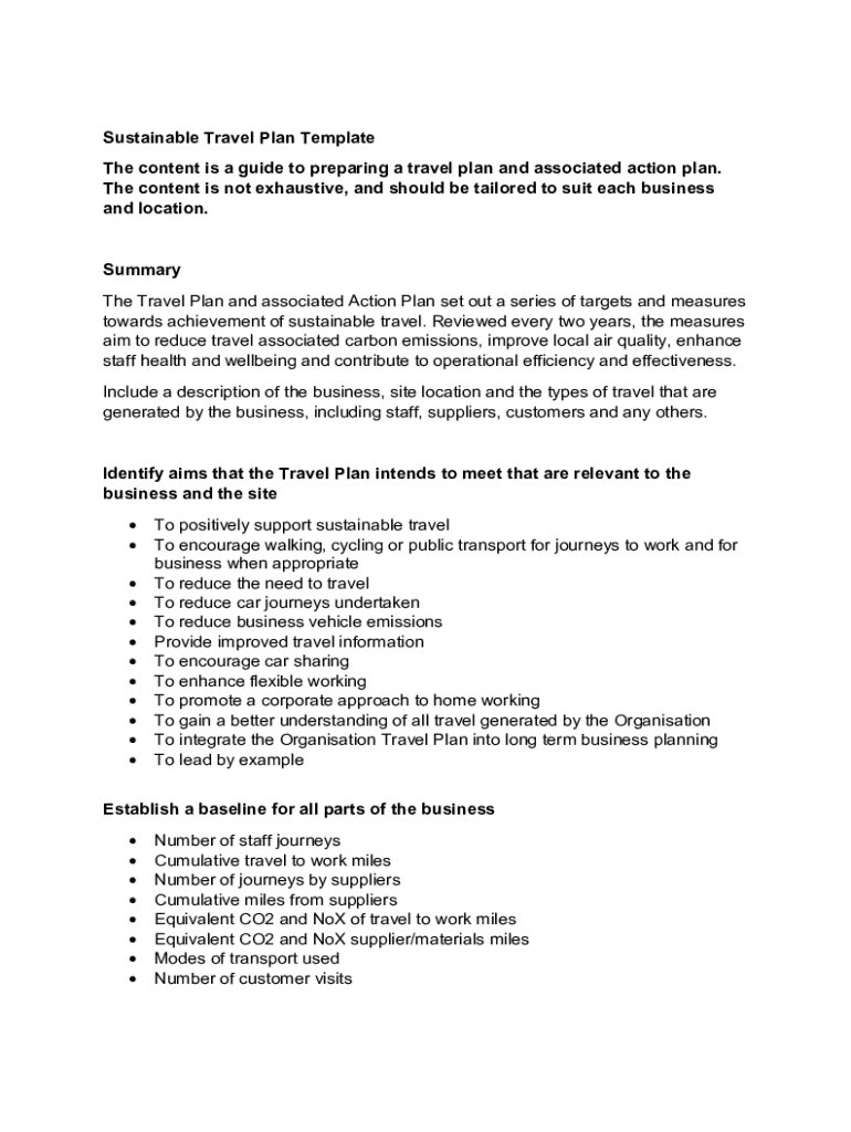 Sustainable Travel Plan Template The content is a guide to preparing a travel plan and associated action plan. The content is not exhaustive, and should be tailored to suit each business and location.