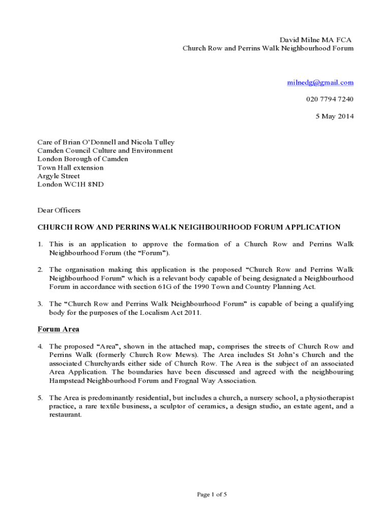 David Milne MA FCA Church Row and Perkins Walk Neighborhood Forummilnedg@gmail.com 020 7794 7240 5 May 2014 Care of Brian O'Donnell and Nicola Tulsa Camden Council Culture and Environment London Borough