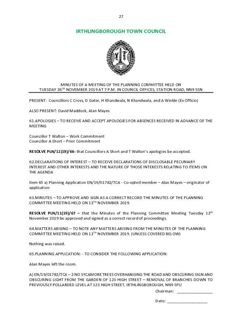 27IRTHLINGBOROUGH TOWN COUNCILMINUTES OF A MEETING OF THE PLANNING COMMITTEE HELD ON TUESDAY 26TH NOVEMBER 2019 AT 7 P.M. IN COUNCIL OFFICES, STATION ROAD, NN9 5SN PRESENT: Councillors C Cross, D