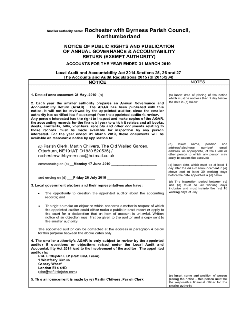 Smaller authority name:Rochester with Byrnes Parish Council, NorthumberlandNOTICE OF PUBLIC RIGHTS AND PUBLICATION OF ANNUAL GOVERNANCE & ACCOUNTABILITY RETURN (EXEMPT AUTHORITY) ACCOUNTS FOR THE